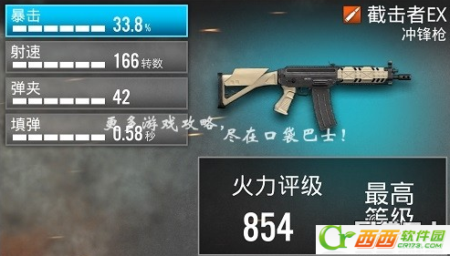 属性明细:暴击33.8%;射速166转数;弹夹42;填弹0.58秒