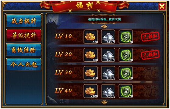 等级提升,战力提升奖励,随着玩家等级要求和战力要求的逐渐增高,可以一次性领取对应的黄金奖励,到40级,玩家总共可以领取到200黄金,且等级越高领取的黄金数量也越大。第一天,努力的豆粉们,一般都能达到40级左右,所以这200黄金也是很容易就拿到的。