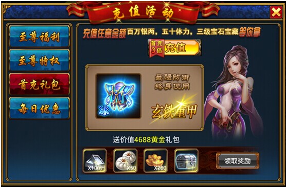 充值呢,首充礼包中会有200黄金,首充三倍是你充多少,官方就送你2倍的等额黄金。对于花钱不多的玩家来说,领取个首充礼包也是很划算的。但是首充三倍,小编建议在条件允许的情况下,第一次充值10000黄金是最划算的,因为游戏可选额度最高也就10000黄金,那就果断10000黄金吧。这个设置很好,免去了豆粉们的纠结,有的游戏首次充值没有上限,那可真是让很多玩家纠结啊。