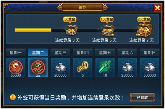签到,也是获得黄金比较重要的渠道,只要每7天连续签满,就能获得总共350黄金。