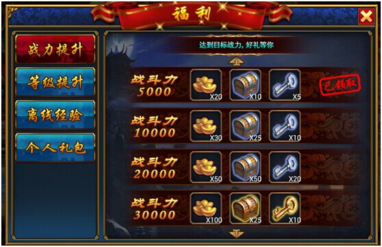 战力提升的奖励,第一天战力达到20000战斗力问题是不大的,达到20000战斗力总共就能领取到100黄金。
