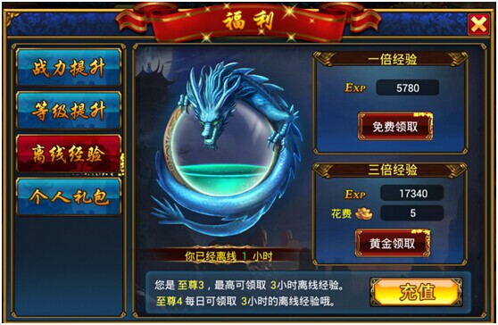 每日离线经验,千万不要选择普通领取,花黄金3倍领取才是最划得来的,想要冲级,经验是王道。