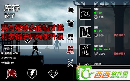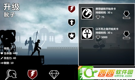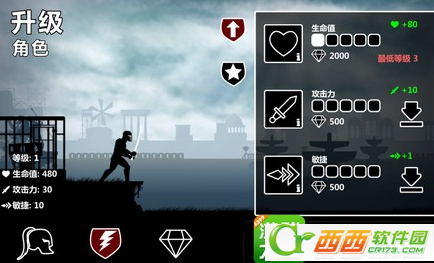 2、升级装备很重要。玩家有了足够的水晶就能将装备进行升级了,东东建议玩家要将生命值最先升级,游戏过程中是无法补充血量的。