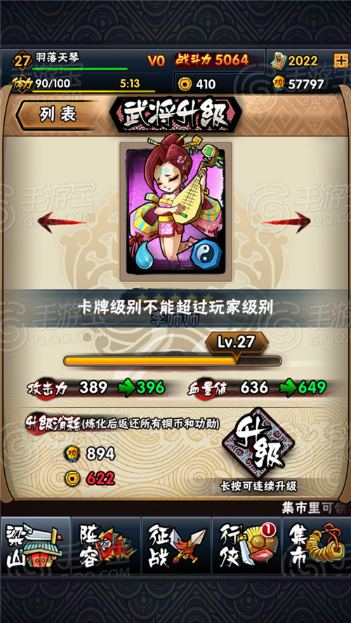 等级:可以个人的等级提升,然后消耗金币和功勋去升级自己的武将。当然,升级武将的时上限条件是不能超过你的个人等级。金币不足的可通过票号兑换、行侠闯荡、矿场争夺、副本通关、行侠蹴鞠,功勋行侠闯荡、副本通关、行侠相扑来获得。