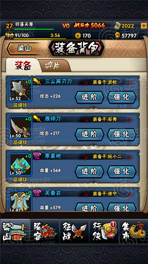 游戏前期,装备的强化与进阶可以大幅度提升战斗力,尽量来进阶蓝色级以上装备,当然,装备炼化时是会返回材料的。装备不足的情况下,建议根据装备的属性来分配给各武将,比如防御性能的,优先考虑配给先锋与豪侠;攻击性装备优先考虑战将。