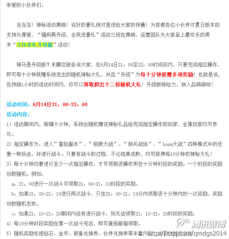 当当当!“福利再升级,全民送豪礼”活动三揭晓,运营团队为大家呈上“连环送礼升级版”活动!在6月14日21:00至22:00时间段内只要完成相应操作,即可每十分钟获赠系统送出的随机神秘大礼,并且“升级”为获赠多项奖励! 升级版够给力,拼人品萌萌哒!点击图片查看具体活动内容哟!