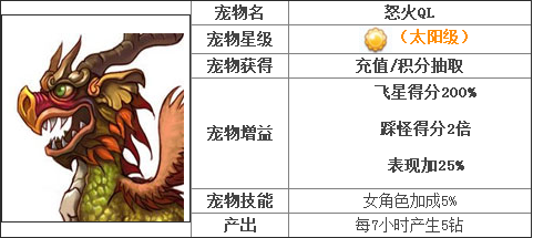 玩家在游戏6月15日更新后充值100元即可获得这个拉风的神级宠物,另外积分抽奖也有很低的概率能抽到,这就完全看脸了。