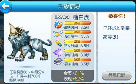 要说到糖白虎的最佳角色搭配,那当然要推选闪电骑士了!他擅长三连跳,同时还擅长滑行。此外,闪电骑士的特技是,缩短超级模式的时间,能更快的到达超级奖励,满级的闪电骑士可加速56%。奖励加速56%的意思是,进入超级奖励所需金币数,减少为100%/(100%+56%)=64.1% 。换个角度说,别人可能三千米进三次超级模式,他能进四次。闪电骑士可以更加快速地进入超级奖励,而糖白虎的技能是在奖励关卡中获得4倍得分,他们俩简直就是绝配。