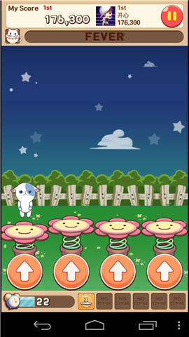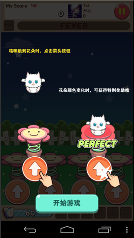 猫咪跳到花朵的时候,要点击箭头按钮将猫咪接住。要注意同步的时间要完全吻合,超微慢点都算作MISS的。当花朵颜色变化时,可以获得特别奖励,要特别注意。