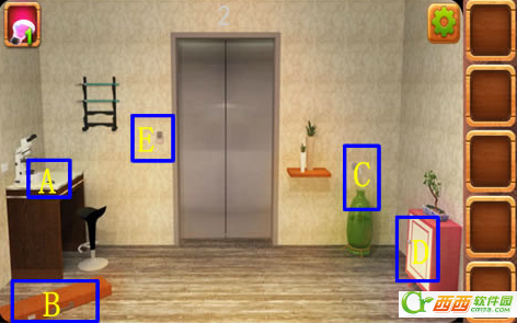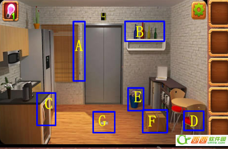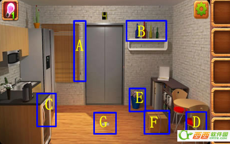 攻略:在A处可以拿到一根“棒子”;观察B处酒瓶的颜色顺序:蓝、红、黄、绿;调查C处的烤箱,根据酒瓶的颜色顺序来点击按钮,完成后得到“开瓶器”;调查D处的椅子,得到“电池”;调查E处的花瓶,移开后用“开酒器”打开得到“小刀”;调查F处的箱子,用小刀切开绳子,打开后得到“手电筒”,然后把“电池”装到“手电筒”上;调查G处,用“开酒器”打开,然后用“手电筒”照射,再用“棒子”取得“钥匙”,最后开门成功逃脱;