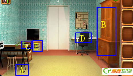 攻略:拿起A处的“锯子”;调查右边的柜子,在上面柜子用“锯子”可以取得“管道”;下面柜子可以拿到“笔记本电池”;调查C处的电视柜的模型车,记住车的颜色:黄、蓝、红、绿;调查D处的笔记本电脑,把“电池”安装上,然后根据模型车的颜色顺序打开电脑,会看到一个点阵图,记录下来;然后调查电视柜下面E处的保险箱,根据电脑的点阵图来调查按键,然后用“管道”扭开右边的按钮得到“钥匙”,最后用“钥匙”开门,成功逃脱;