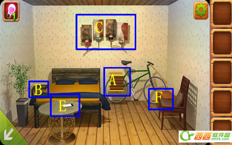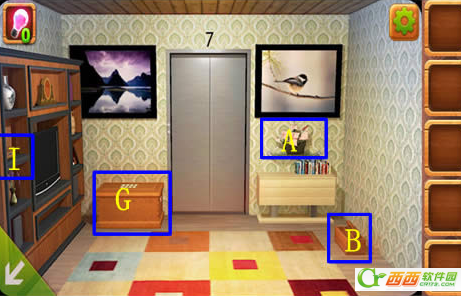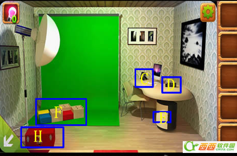 攻略:首先调查A处的帆船,可以找到“钥匙1”;调查B处可以拿到“螺丝刀”;然后来到工作室,调查C处的相架,用“螺丝刀”得到“存储卡”;调查D处相面,发现密码:4841;调查E处密码柜,输入4841,打开后看到一排格子分别是:透明-白-白-透明-白-白;然后观察F处的格子的颜色;回到客厅,先看看地板上地毯格子的颜色,再结合工作室格子的颜色,得到顺序是:第一排是:黄-绿-灰-黄、第二排是:蓝-灰-红-灰;调查G处的柜子,根据前面得到的格子颜色,打开后得到“剪刀”;回到工作室,调查H处的箱子,用“剪刀”剪开锁,得到“数码相机”;调查“数码相机”把“存储卡”放入,可以看到上面一排数字;调查I处的密码盒,根据工作室抽屉和数码相机的提示,密码盒上面第一个和第四个的按钮不用按,然后输入:4316,得到“钥匙2”,然后用两只钥匙开门,成功逃脱;