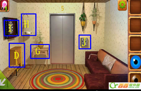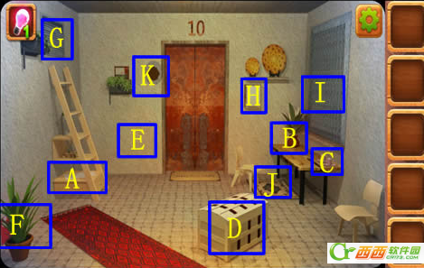 攻略:先来到左边卧室,在A处拿到一颗“蓝眼睛”;调查B处得到“灰眼睛”;然后观察墙上C处的画,记住颜色:桃红、浅蓝、黑、白;回到客厅,调查D处的柜子,用卧室墙上画的颜色顺序来调整,打开后得到“铅笔”;回到卧室,调查E处的纸,用“铅笔”得到密码“321323”;调查F处的柜子,按密码“321323”来调整,打开后得到“钥匙1”;回到客厅,调查G处的柜子,分别把两个“眼睛”装上,得到“谷物”;然后调查H处的小鸟,把“谷物”给它得到“钥匙2”;调查I处的飞镖盘,记录下:绿8蓝5红4;调查J处的密码箱,插入两只“钥匙”,然后在左边输入:845,然后加上右边的数字,得到总数:974,输入后门打开,成功脱逃;
