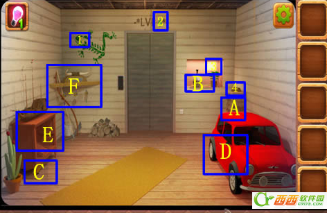 攻略:在下图中1.2.3.4的位置找到彩色数字:黄2、绿6、蓝2、红6;调查A处的柜子输入:2662得到“蓝称砣”;在B处拿到“杆子”,在C处拿到“千斤顶”,然后把“杆子”和“千斤顶”组合;调查D处,用“千斤顶”顶起,得到“红称砣”;调查E处,第三排的数字是:6-2-7,第四排的数字是:3-2-1-7;完成后得到“绿称砣”;调查F处,把相应颜色的称砣挂到钩上,然后点击牛头得到“红钥匙”;然后用钥匙开门,成功逃脱;