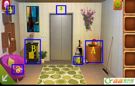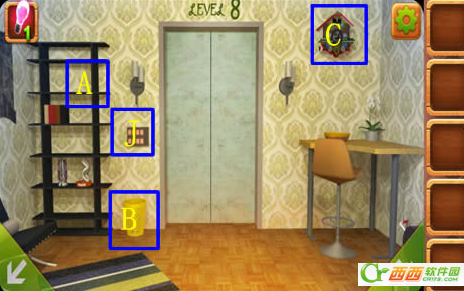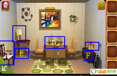 攻略:调查A处的柜子,可以拿到“紫灯泡”,柜子上的蛋可以拿到“小钥匙”;调查B处柜子,完成拼图后得到“绿卡”;来到左边餐厅,调查C处餐桌,记住盘子上的颜色:蓝-红-绿-黑-橙;调查D处的台灯,装上“紫灯泡”,开灯后看到:XOX-OXO-XOX;调查E处,把前面得到的英方字母“X”的地方就按下去,然后再根据盘子的颜色顺序,打开后得到“蓝卡”;回到门厅,分别在1.2.3.4处分别找到4个不同颜色的数字:橙8-绿9-蓝3-红4;回到餐厅,调查F处的密码盒,输入:9483,得到“螺丝刀”;把G处的椅子往右移动,然后调查椅子墙上面的一个能风口,用“螺丝刀”和“钥匙”得到“红卡”;调查H处的心形,其中大心形下有一排颜色分别是:白蓝-红白-黄绿;回到大门处,分别把三种卡插上,然后按照前面找的到颜色组合来点击,成功开门逃脱;
