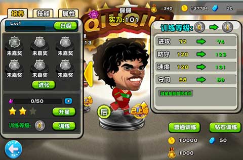 在球员养成生涯模式上有着不小的改变,每个球员根据初始属性从低到高依次分为D、C、B、A、S,每个种类的卡可以进化到的上限也是有差别的。同时球员的培养模式包括训练、升星、进化、升级,所需的材料基本可以通过副本获得。要想养成顶级球星,每一环都缺一不可!只是点击技能显示“即将开启”还是让小编有点小小的遗憾。