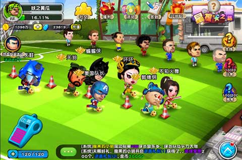 游戏画面风格十分独特,一入游戏就是浓浓的Q版漫画风。明星乱入的丰富卡牌加上特色的地图副本,静态画面做得相当到位。画面整体偏卡通但又不失清新感,尤其是游戏场景的革新不可谓不大,非常符合广大宅男、伪球迷们的胃口。战斗画面还算比较中规中矩,特效虽说不上狂炫酷拽,但绝对也是精心打造。