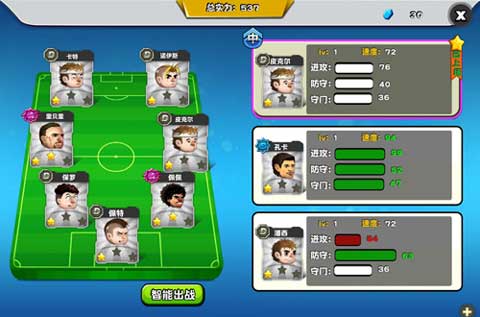 游戏中的排兵布阵玩法,不同于目前市面上的大多足球游戏的排布方式,游戏内总计设计了7个位置,其中前锋2个,中场2个,后卫2个,门将1个,标准的2-2-2阵型,每个位置的球员属性也不尽相同,例如同样是中场的蓝色B卡孔卡初始的进攻属性就高达99,而防守能力却比同为白色D卡潘西都少,这也导致了每个球员都有自己的存在价值。