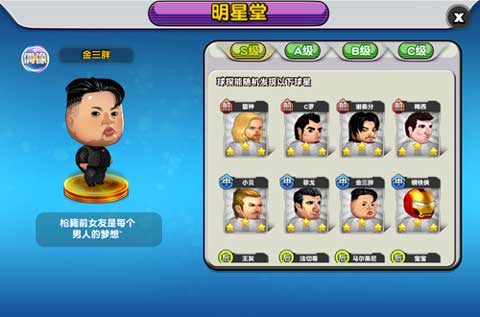 游戏中的名将收集、养成和副本推图应该是游戏的核心内容了,喜欢罗纳尔多、梅西等一线足坛巨星的玩家可以去招募一队足坛梦之队,当然对足坛球星不感冒的玩家也可以招募谢霆锋、王菲、擎天柱等一批偶像明星征战足坛。