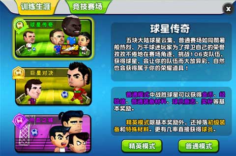 在模拟足球赛制的基础上,《踢你妹》拥有PVE、PVP两种对战模式,满足玩家突破自我和挑战极致的游戏追求。在PVE玩法中,可供玩家选择的赛制涵盖球星传奇(又分精英模式和普通模式)、巨星对决、热血传奇等,玩家可以通过这些副本获取所需的材料和升级的经验。PVP玩法则采用天梯匹配的模式,在实力相当的前提下,只有精心排兵布阵才能不断达成新的成就、挑战更高的比赛排名。