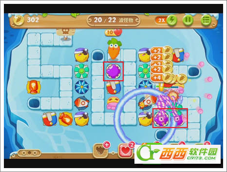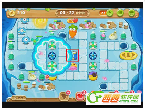 保卫萝卜2先用章鱼炮打出各种各样的减速炮塔,在减速炮塔周围集中火力,即可过关。