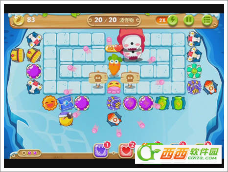 2、前6波靠满级的章鱼炮即可消灭,第7波每边会出现4只BOSS,这里需要停止清除道具,权力全开打BOSS,否则萝卜很容易被咬。