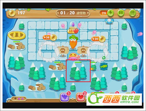 3、打完第7波后,可以将右下绿色的大树打掉,这里也可以获得2~4个随机炮塔。