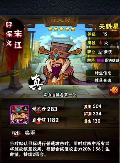 宋江的特点是攻击结合回血,而且是全队回血。所以宋江的定位可以算是攻击加辅助,而且辅助效果卓越。两回合的20%攻击回血能够给那些脆皮提供强有力的支援。