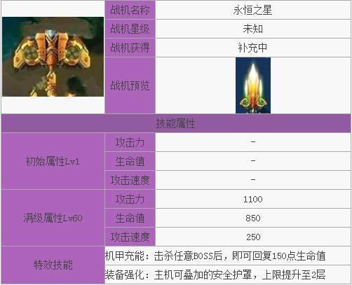 永恒之星的攻击力整整高出了黑龙公主150点,超强的攻击力加上超高的生命值,连带着攻击速度都是目前最高的,绝对是最强战机啊。