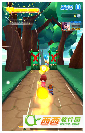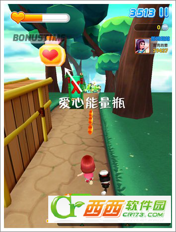 与一般跑酷游戏不同,我们在碰到障碍物后不会立刻结束游戏。但是左上角的能量条会有所缩减。当能量条为零时就无法继续奔跑。所以我们一定要时刻注意在跑到上出现的“爱心能量瓶”,它是我们补充能量的主要来源。