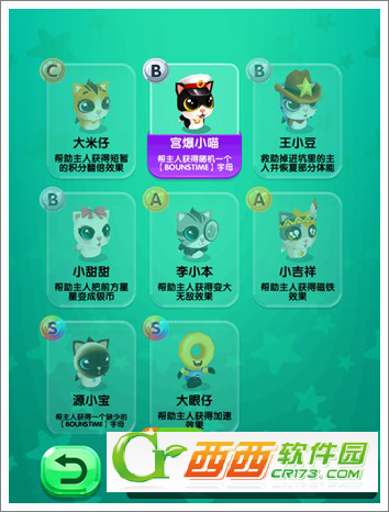 除了萌娃和星爸,游戏中共有8只宠物供我们选择。每只宠物都有着不同能力,例如吸金或是救助主人等。而且宠物和4个角色中还存在着最佳组合。最佳组合能够带来额外的属性加成。例如王小豆和毅哥组合就能使BonusTime时间增加5秒。