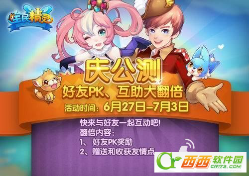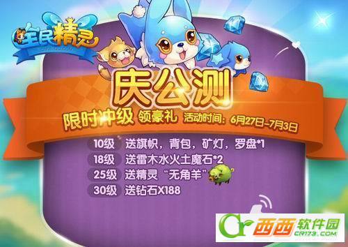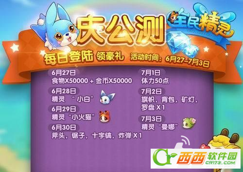 6月27日至7月6日期间,为迎接《全民精灵》萌动公测火爆来袭,游戏中特别推出了一系列精彩活动,为公测助兴。活动期间,玩家在游戏中等级达10级、18级、25级、30级,即可获得旗帜、背包、精灵“无角羊”、钻石等惊喜奖励。同时,活动期间每天登录游戏,还可领取每日登录豪华礼包,将金币、食物以及超萌精灵“小白”、“小火猫”、“曼娜”等带回家。