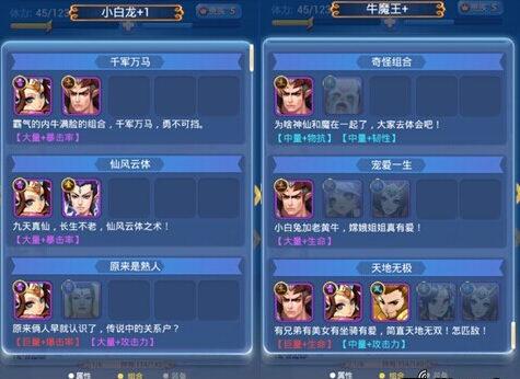 卡牌组合就是你在上阵队伍中,包含组合中的卡片人物,那么就会增加指定的属性,例如,我把小白龙和牛魔王同时上阵,就会增加大量的暴击率,如果我把杨戬,小白龙,牛魔王3个同时上阵,会增加双重的大量暴击率,效果可想而知了。那么卡片的组合在副本大闹天宫中到底有啥实质性的帮助呢,大家别着急,我马上进行分析,大家应该有看到天地无极这个组合,这个组合是目前所有组合中最平衡而且附加属性也是最多最实用的组合了。里面包含了能抗的牛魔王,单输出最给力的悟空,医疗奶妈嫦娥,还有群法小白龙,最后是后排杀手紫霞仙子。这5张卡组合起来在能让你在未知的战斗中不处于下风,如果等级和技能也练起来了那是相当给力的。还有最最重要的一点,就是它们5个组合起来还有组合效果的巨量生命加成和中量的攻击力。而我们在大闹天宫副本中最担心的就是阵亡,因为阵亡了我们就只能用替补替换,在我们后备军不是那么充裕的情况下保证存活率,就是通关副本大闹天宫的关键。所以如果玩家善于利用卡牌的组合,相信一定无论是在闯大闹天宫,还是推图或者和玩家PK中,都能如虎添翼的。