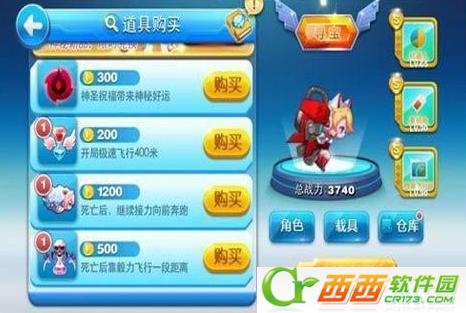 点击按钮享受到喷飞的快感,玩家通过寻宝功能获取载具和载具组件,越好的载具初始属性越好,游戏中分为C-S四个等级,想要获得终极的S级装备需要大量的财力和十足的运气,当然了即使你有了高级载具还是需要通过组件的强化才能获得好的效果,载具可以镶嵌3个部件,分别是智能兴片、火箭背包、UFO三个不同类型的部件,可以提升载具的速度、持久力和战斗力。