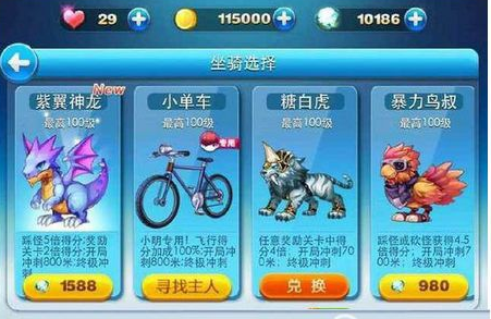 2014年是马年,适逢新年,拥有3倍踩怪积分的梦幻神马一经推出便迅速点燃了玩家们的激情。而前不久在《天天酷跑·里约进击版》中推出的暴力鸟叔更是完全碾压小绵羊和梦幻神马,不仅可以开局冲刺700米和终极冲刺,而且踩怪和砍怪都可以获得4.5倍得分。