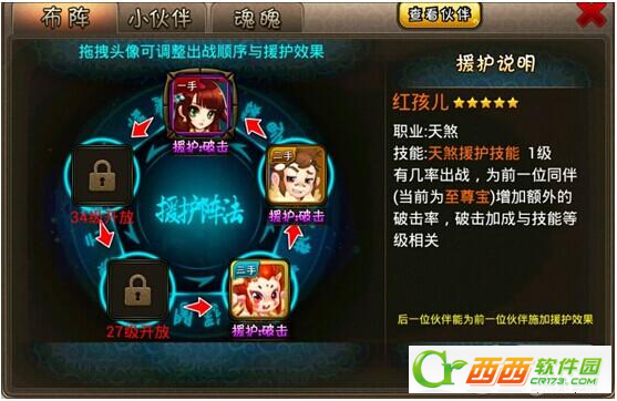 每个伙伴有不同的攻击方式,还有自己的职业属性,职业的不同也会影响到小伙伴的援护技能——神将:攻击,修罗:吸血,飞仙:加血,妖灵:闪避,天煞:破击,魔王:防御。