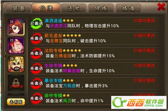 除了在援护时,主角会因搭配的伙伴不同而获得不同的援助,在主角与不同的小伙伴组队时也会产生不同附加属性,这就是仙缘系统的功劳啦。比如在游戏中战意增加啦,攻击力提升啦。每个小伙伴的仙缘都不一样,触发的附加效果也是不同的。如果已经是达成触发仙缘的要求,游戏画面中就会显示已激活。而且游戏中可以招募的小伙伴非常多,不同的搭配也会有不同的效果哦。听了那么多,不如拿起手机照攻略玩一玩吧,说不定你能发现新的游戏技巧哦。