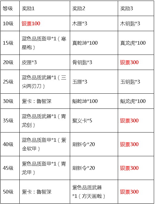 每提升5级,即可在“梁山“的冲级礼包中领取大量银票哦~具体奖励列表如下:
