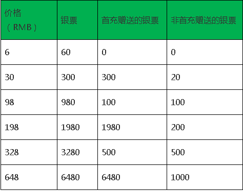 人民币兑换银票~比例为1:10, 例如, 充值6元得60银票~