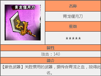 【紫色武器】 关胜惯用的武器,据传含青龙之血,故得此名
