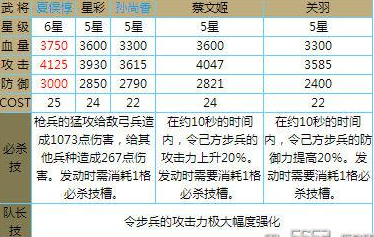 推荐理由:透过属性可以看到蔡文姬和星彩都处在第二强的层面上,但是蔡文姬的必杀技是提升20%己方所有步兵的攻击力,这样使得队伍总体攻击能力有很大的提高。