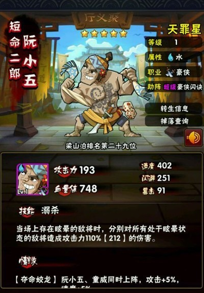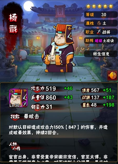 小编点评:眩晕阵必备核心武将,如果你后期想要培养眩晕阵,那么小五你一定不能错过。
