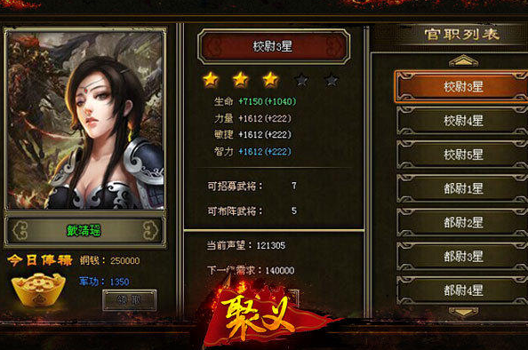 大黑新游《聚义》打破了以往君王封爵掌控天下大权的局面,首创武将封衔玩法,拥有官职的玩家,同样可为帐下武将封衔。如,五星都尉手中拥有五个封衔名额,最高可将帐下武将的官职提升为裨将,令他们全方面属性大量提升,并且带兵上限也会随之提升。随着玩家官职的提升,所能分封的武将名额将越来越多,并且所分封的官职也将逐步提升,打造出属于你自己的官僚集团。