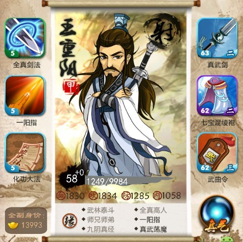 3、均衡:大掌门有很多菜刀,大r不缺这一个还要废弟的真人,对于非r,加攻防的都要,加血减内、加内减血的视情况定,王重阳内成长很高,不怕洗,这样技能也可有一定伤害