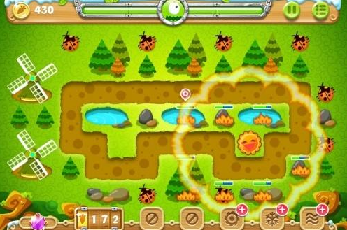 丛林主题第19关中额外任务有(1)使用太阳花塔消灭50个怪物;(2)成功建造6个太阳花塔(顶级);(3)在99秒内获得1200金钱。本关中可供选择的炮塔有火箭、便便、太阳花塔等三种,关卡初始有450个金币可用。游戏开始会获得火箭新炮塔。在本关地图中,主要有树木、风车、大松树、树根、石头、瓢虫等道具,可以用于建造塔防的空间,主要在火箭塔右侧和地图左下角位置。