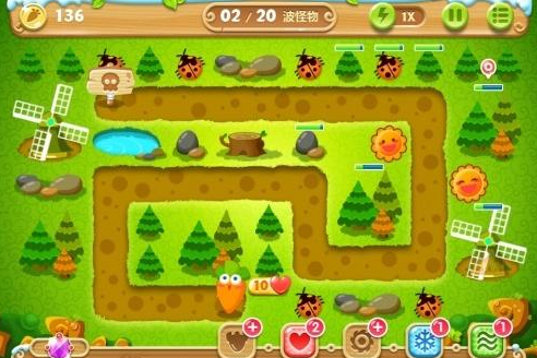 本关游戏中除了小怪物外,从第8波开始,还会陆续出现飞行怪物群,特别是第10波、15波、20波都会有大怪物,甚至大怪物群出现,需要玩家在怪物路线附近多安装和升级太阳花塔,并升级火箭炮塔,增强攻防能力,在拐角等关键位置还可适当安装便便塔更有利于减缓怪物的进攻速度。总体来说,游戏难度不大,关键是在游戏开始时要将火箭炮塔换装太阳花塔,更有利于完成额外任务,在后续清除所有道具,消灭所有来袭怪物,即可顺利获得道具全清、金萝卜和水晶萝卜全部成就。