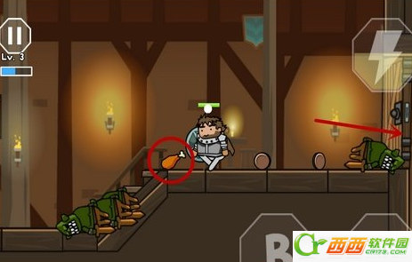 红色箭头所指的门后面就是和BOSS战斗的地方啦,在这之前会从敌人身上掉落鸡腿,如图红色圆圈内所示。吃掉鸡腿就能补满生命值,玩家一定要在战斗前做好准备。
