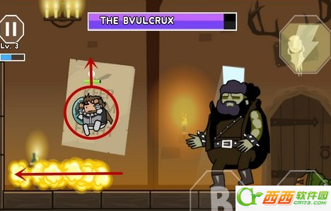 第一关BOSS会高高跳起,玩家要判断他下落的位置然后躲避,如果被他这么沉重的身躯压到可是会受重伤的。同时,他跳起来之还会放几个屁来攻击玩家,屁是直线下落的,玩家也要注意躲避。