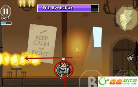BOSS吐出的第二种火焰位置是在上方的,玩家无法用跳跃躲避,这时候要向下滑动屏幕,玩家下蹲才能躲避火焰,如图所示。