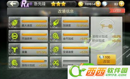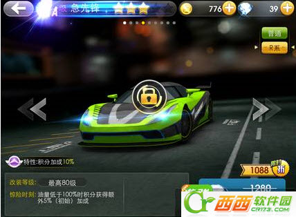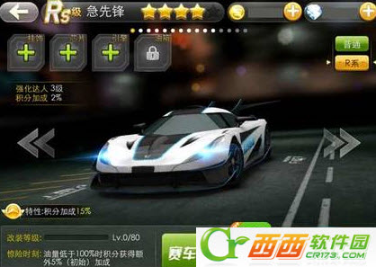 赛车属性:最大速度425KM/h、加速度12.8Km/s、节油效率33.6Km。(后续稍后补充)
